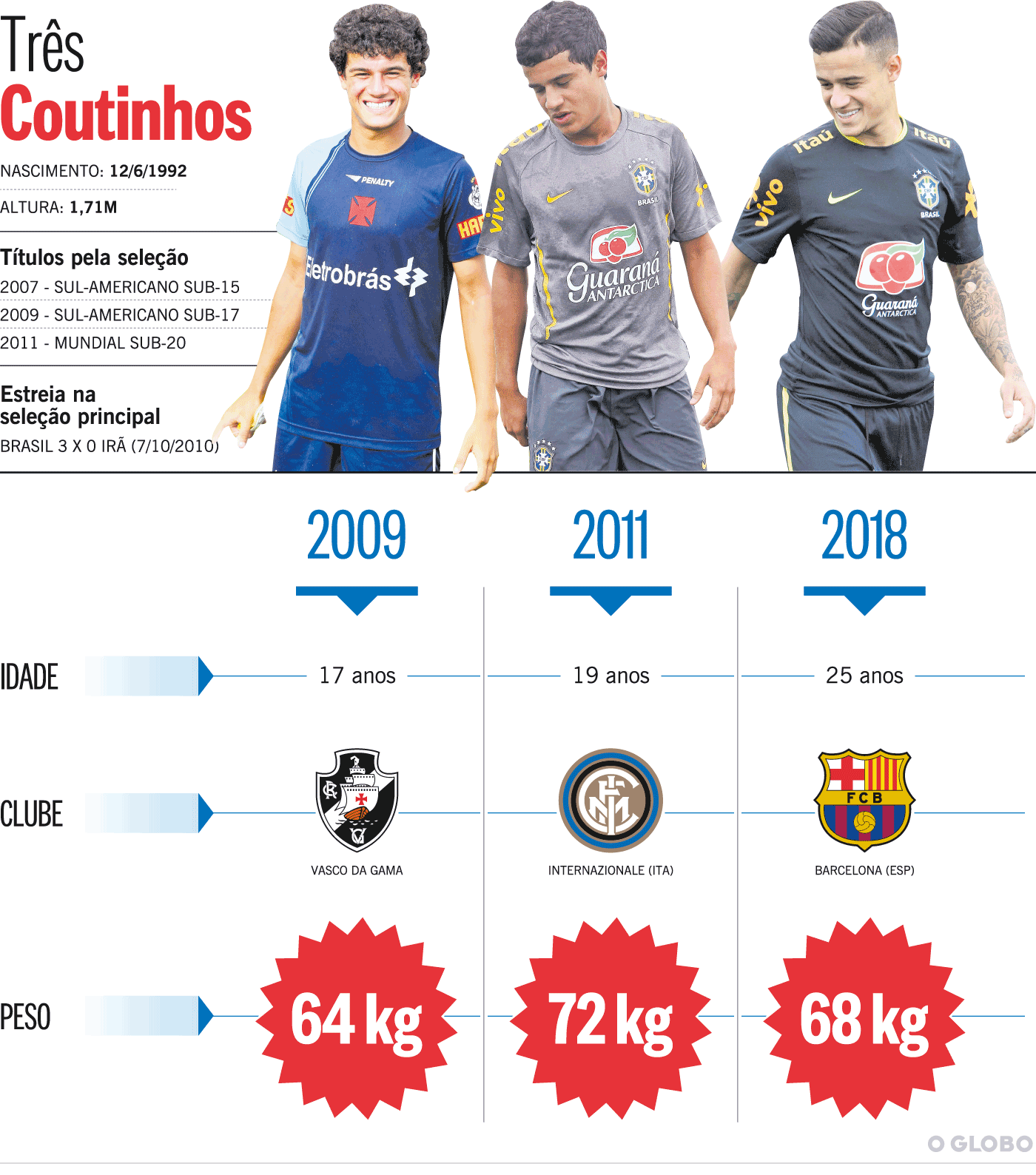 A última vez que Philippe Coutinho havia pisado na Granja Comary para se preparar para um Mundial havia sido em 2011. Na ausência de Neymar, era talvez o grande nome da seleção sub-20 que mais tarde seria campeã. Demorou mais do que todos esperavam para assumir o protagonismo também na equipe principal, mas, sete anos depois e com 4kg a menos, é uma das grandes apostas de Tite na Copa do Mundo da Rússia.