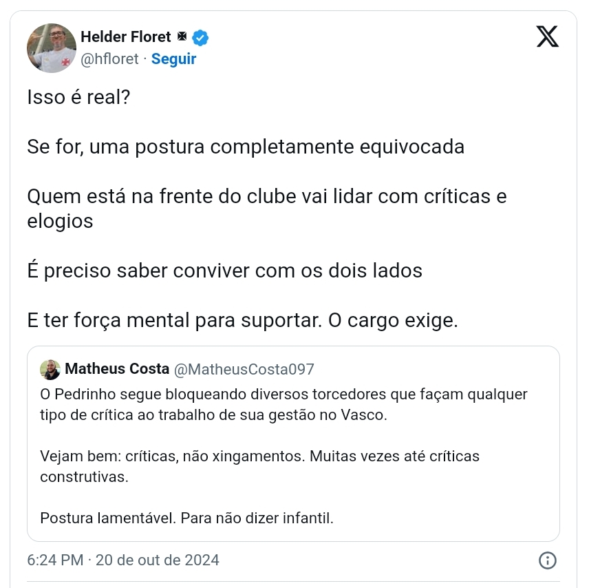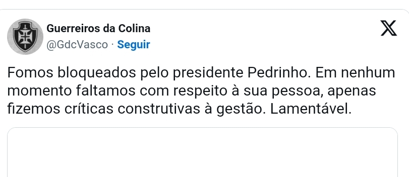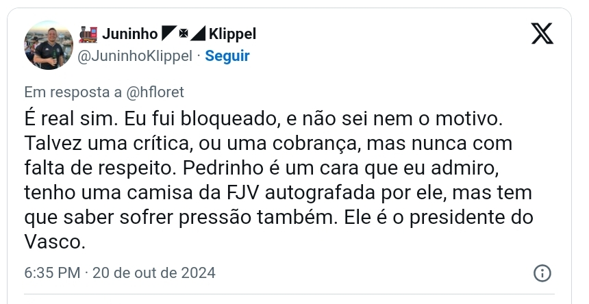 A relação entre Pedrinho e a torcida do Vasco passa por um momento conturbado. O presidente vem recebendo críticas após a eliminação para o Atlético-MG na semifinal da Copa do Brasil, no sábado, e reagiu bloqueando torcedores nas redes sociais e restringindo os comentários em suas publicações.