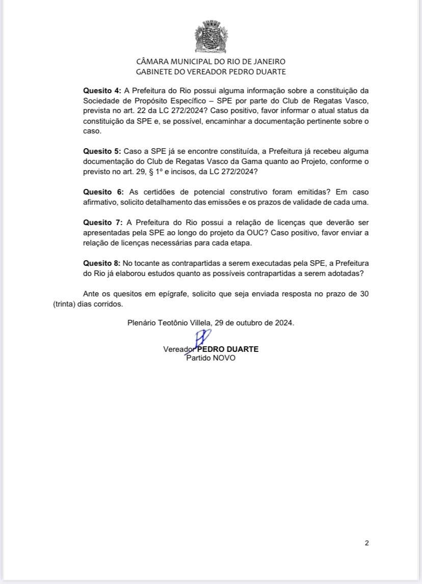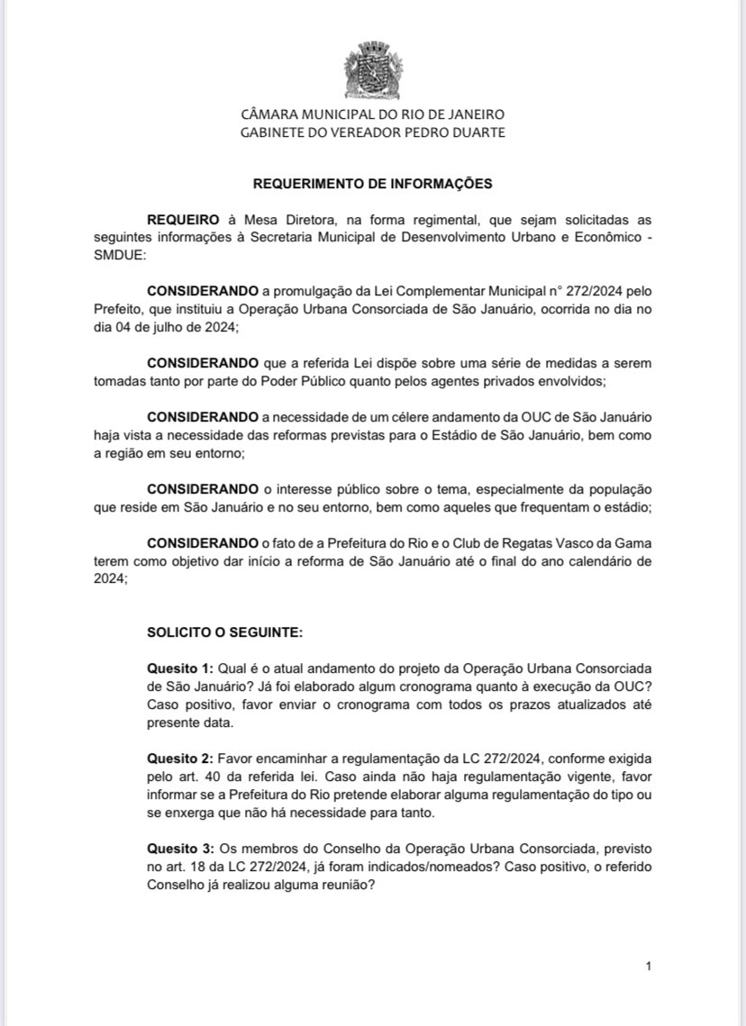Vereador Pedro Duarte cobra esclarecimentos sobre a atual situação do potencial construtivo de São Januário. Pedido protocolado junto a prefeitura pede respostas em 30 dias a movimentos básicos de regulamentação do projeto a captação de novos parceiros.