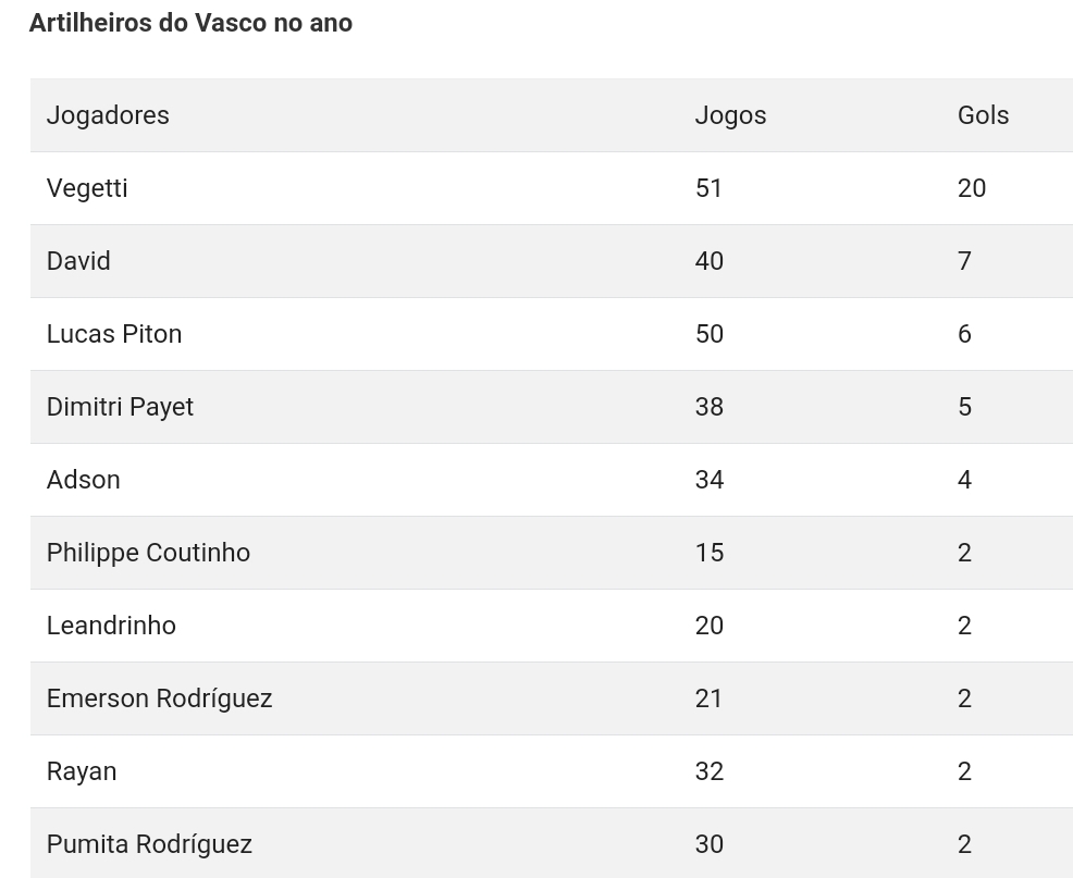 Dos 74 gols do Vasco no ano, 20 foram marcados por Vegetti. O segundo artilheiro do clube no ano é David, com sete gols marcados. Ele sofreu uma ruptura no ligamento cruzado do joelho esquerdo e só volta no meio da temporada que vem. O terceiro jogador com mais gols é Lucas Piton, com seis.